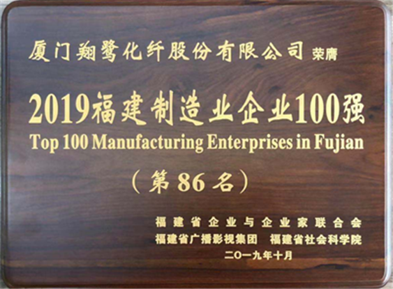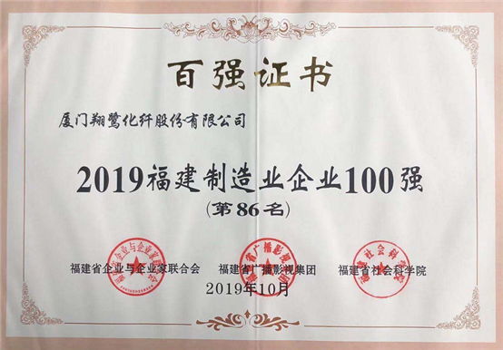 恭賀廈門翔鷺化纖股份有限公司被福建省企業(yè)與企業(yè)家聯(lián)合會、福建省廣播影視集團、福建省社會科學院評為“2019福建制造業(yè)企業(yè)100強”第86名。